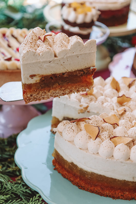 A torta puha piskótával, fehéjas almakrémmel, diókrémes házi vegán karamellel, vanília mousse-al készült.